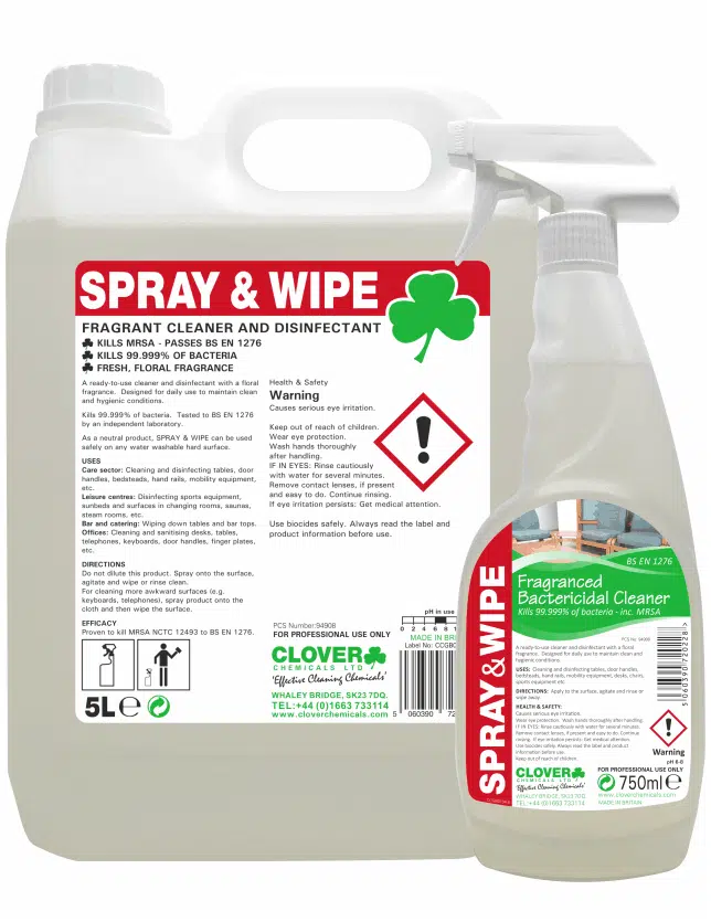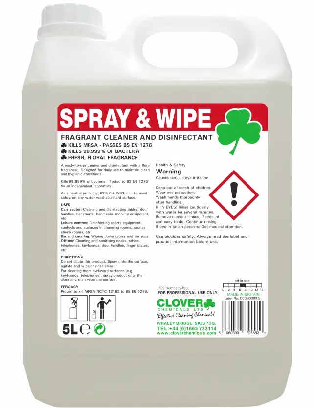 Clover Spray & Wipe is a ready-to-use cleaner and disinfectant with a floral fragrance. Ideal for daily use to maintain clean and hygienic conditions. Kills 99.999% of bacteria, including MRSA and tested to BS EN 1276.