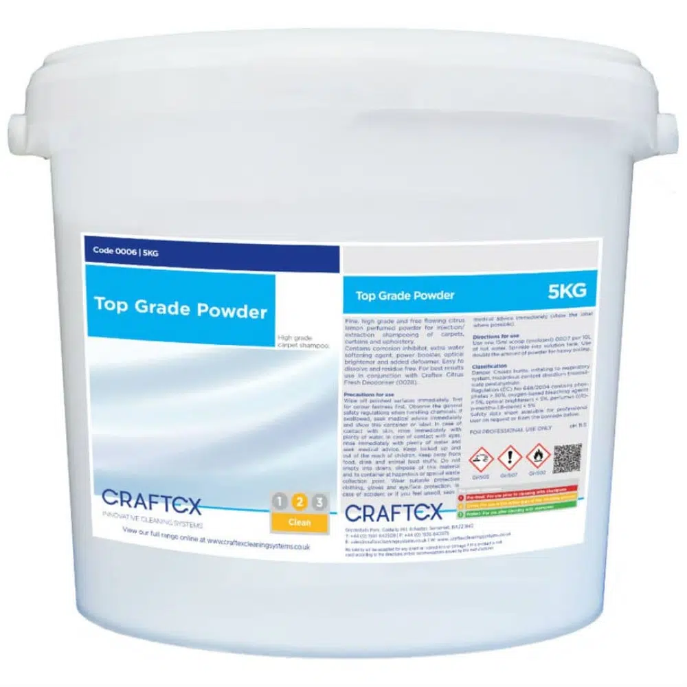 Top Grade powder is a fine , free flowing powder for cleaning carpets, most curtains and upholstery. It contains corrosion inhibitor, extra cleaning agent, extra water softening agent, optical brightener and added defoamer.
