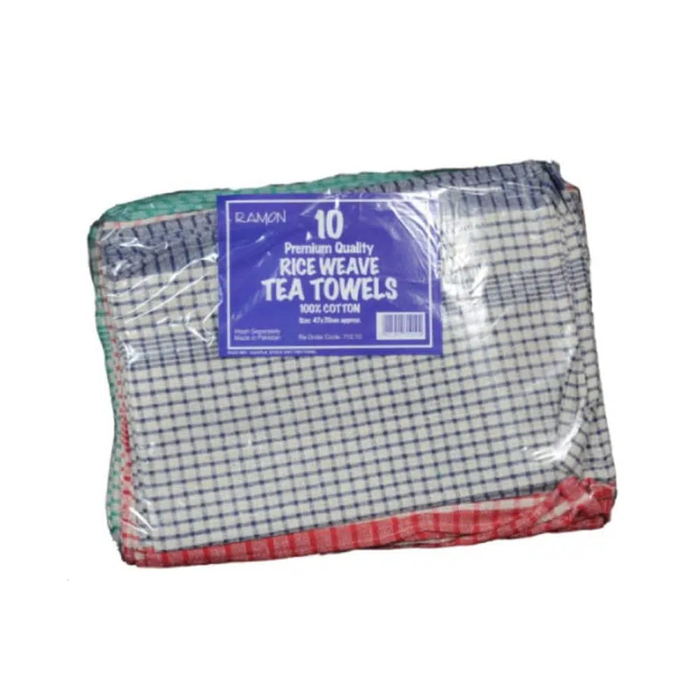 Heavy cotton tea towels for the discerning caterer. Excellent absorbency and durability.