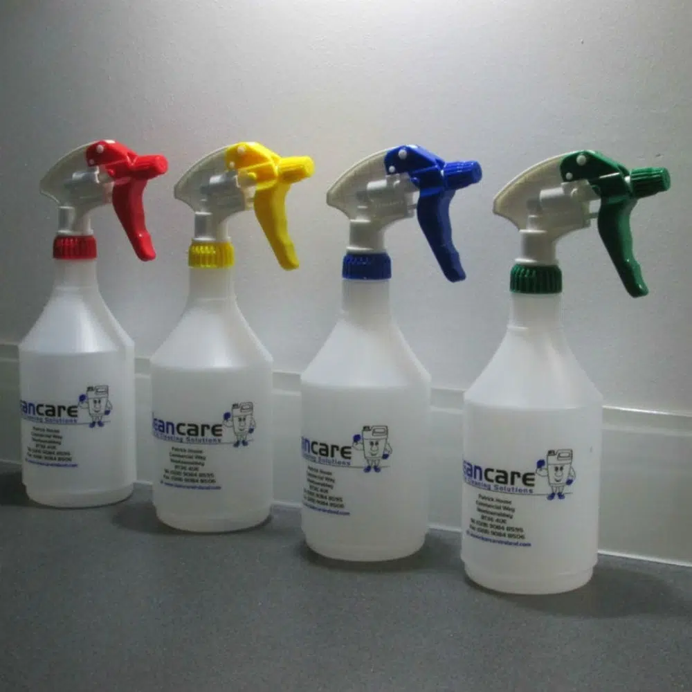 Heavy duty trigger spray bottles 750ml which have triggers colour coded for hygiene and quick identification of chemicals.