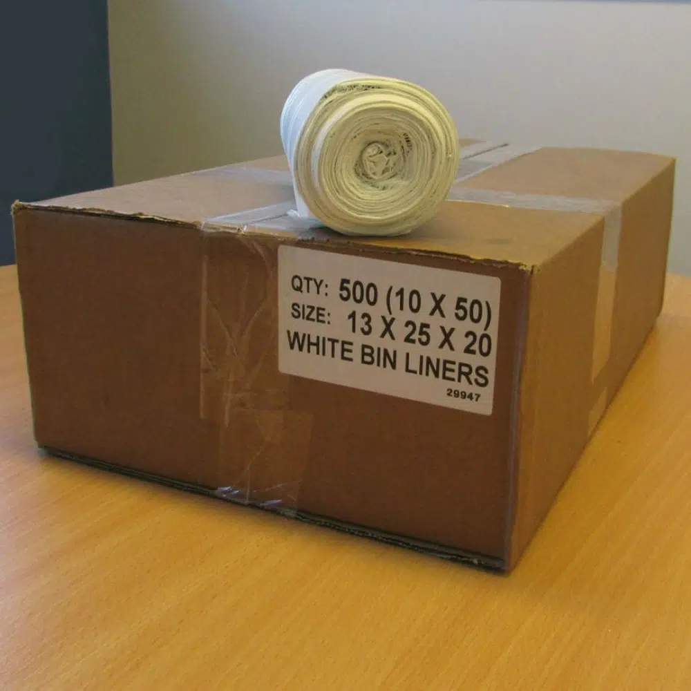 One box contains 500 bin liners (10 rolls of 50), each measuring 13″ x 25″ x 20″.